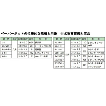 ペーパーポット(ニッテン)のNo.2-264(5H) 主な用途:スイートコーン、アスパラ、カーネーション 1鉢寸法:角3.0×5.0cm 1冊鉢数:264 展開寸法:27×57cm 水稲育苗箱用 植付方法:ハンド移植器 特殊加工した紙で作られた折たたみ式の育苗鉢です。